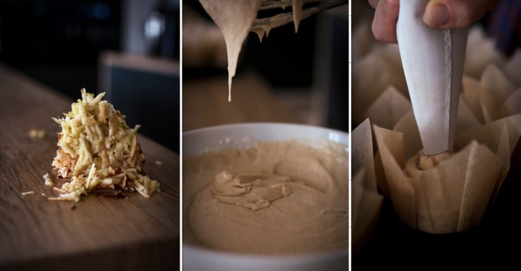 • Vejce vyšleháme s cukrem do hezky nadýchané pěny. Přimícháme rozpuštěné máslo a poté střídavě moučnou směs a mléko. Nakonec zapracujeme i nastrouhaná jablka. Mícháme, dokud nezískáme krásně krémovité těsto, které poté přendáme do košíčků v muffinové formě.