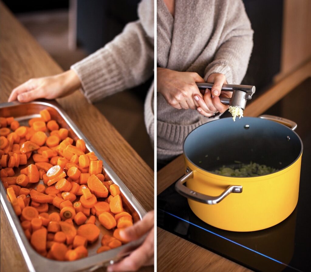 - Nyní přilijeme vývar, citrónovou šťávu, kůru, upečenou mrkev. Vše promícháme a vaříme 15 minut.