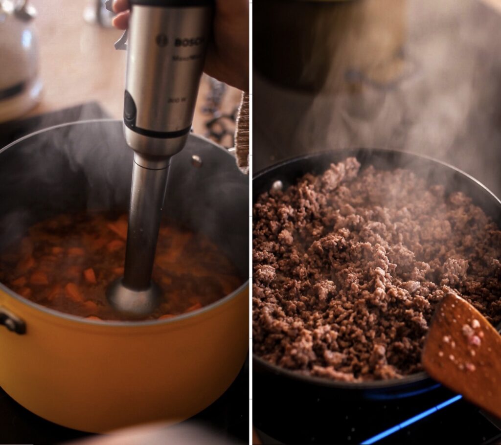 - Než se polévka uvaří, připravíme maso. Na troše oleje ho na pánvi orestujeme. Poté jej dochutíme solí, pepřem a kmínem.