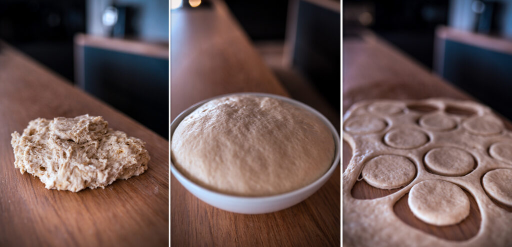 - Vykynuté těsto vyválíme na tloušťku 1,5 cm a poté z něj vykrájíme kolečka o průměru 8 cm.