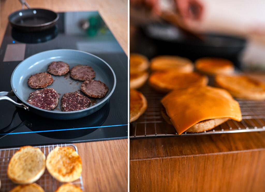 - Upečené muffiny podélně přepůlíme. Lehce je potřeme máslem a poté je zprudka opečeme na pánvi.