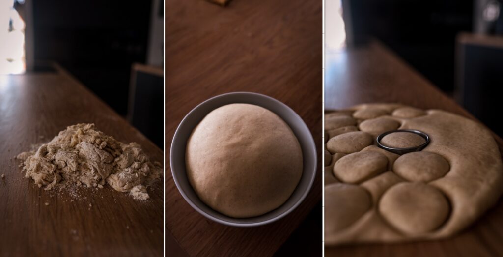 - Vykynuté těsto vyndáme na vál a lehce jej propracujeme, abychom ho zbavili bublin. Poté ho vyválíme na placku o tloušťce cca 2 cm a z ní vykrájíme malá kolečka.