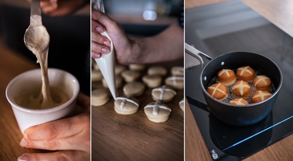 - V hrníčku umícháme mouku s vodou tak, aby vznikla hladká směs. Přeneseme ji do cukrářského sáčku a s jeho pomocí uděláme koblížkům křížek. Takto je necháme 10 minut kynout.