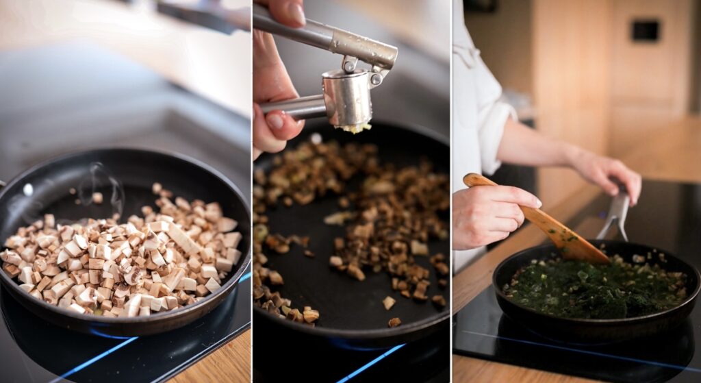 • Žampiony nakrájíme nadrobno. V pánvi rozehřejeme trochu oleje a žampiony na něm necháme smažit. Chvíli trvá, než pustí vodu a hezky zezlátnou. Proces tedy neuspěchejte. Poté přidáme prolisovaný česnek a pokrájený špenát, který necháme zvadnout. Nakonec přidáme dle chuti sůl a pepř.