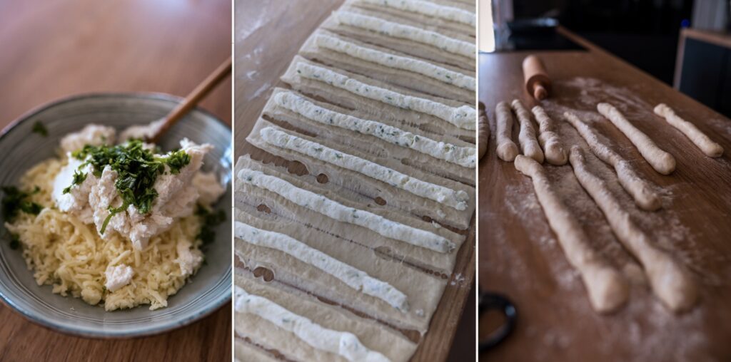 • Mozzarellu nastrouháme, přidáme k ní zelené a následně přimícháme ricottu. Směs přeneseme do cukrářského sáčku s kulatou hubičkou.